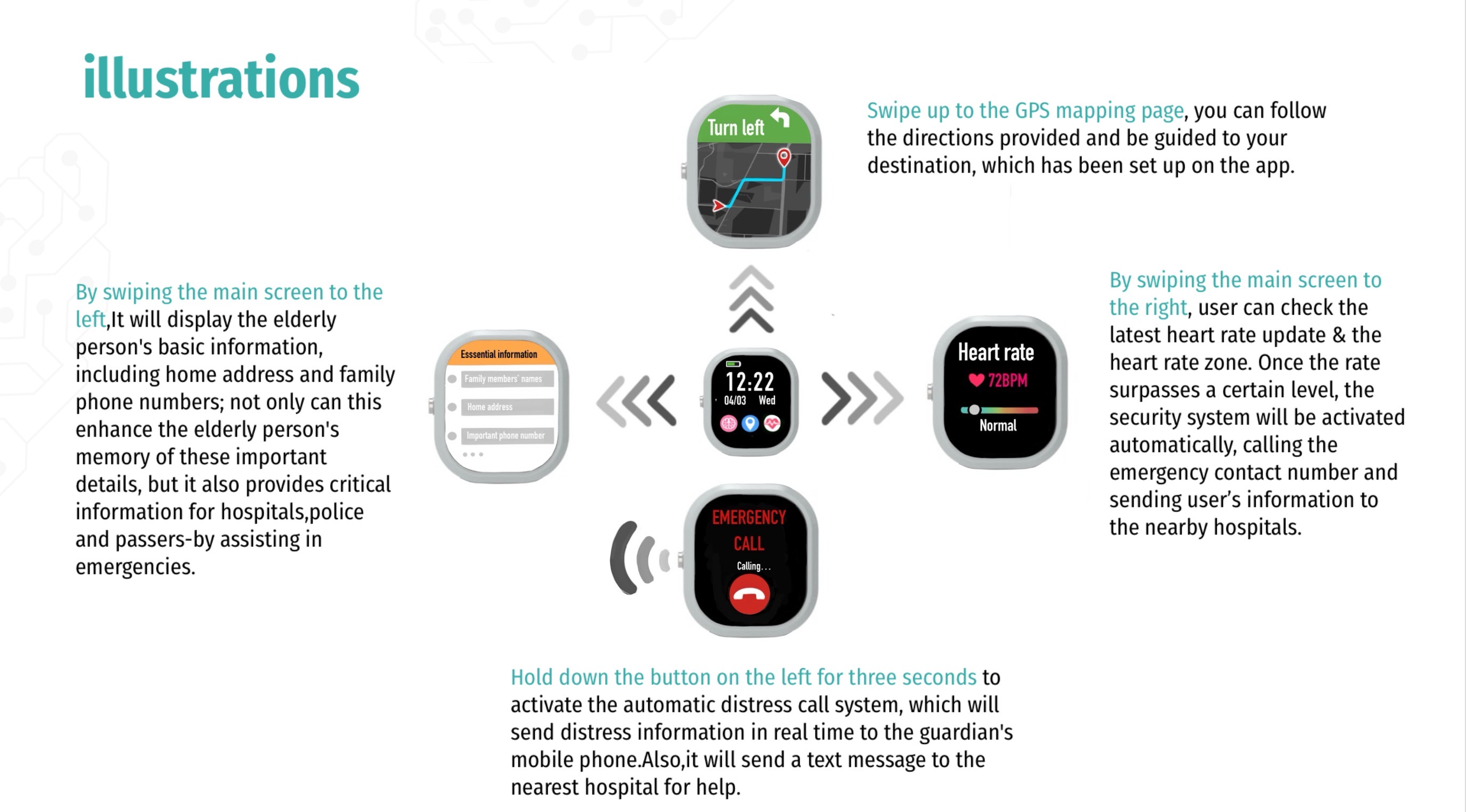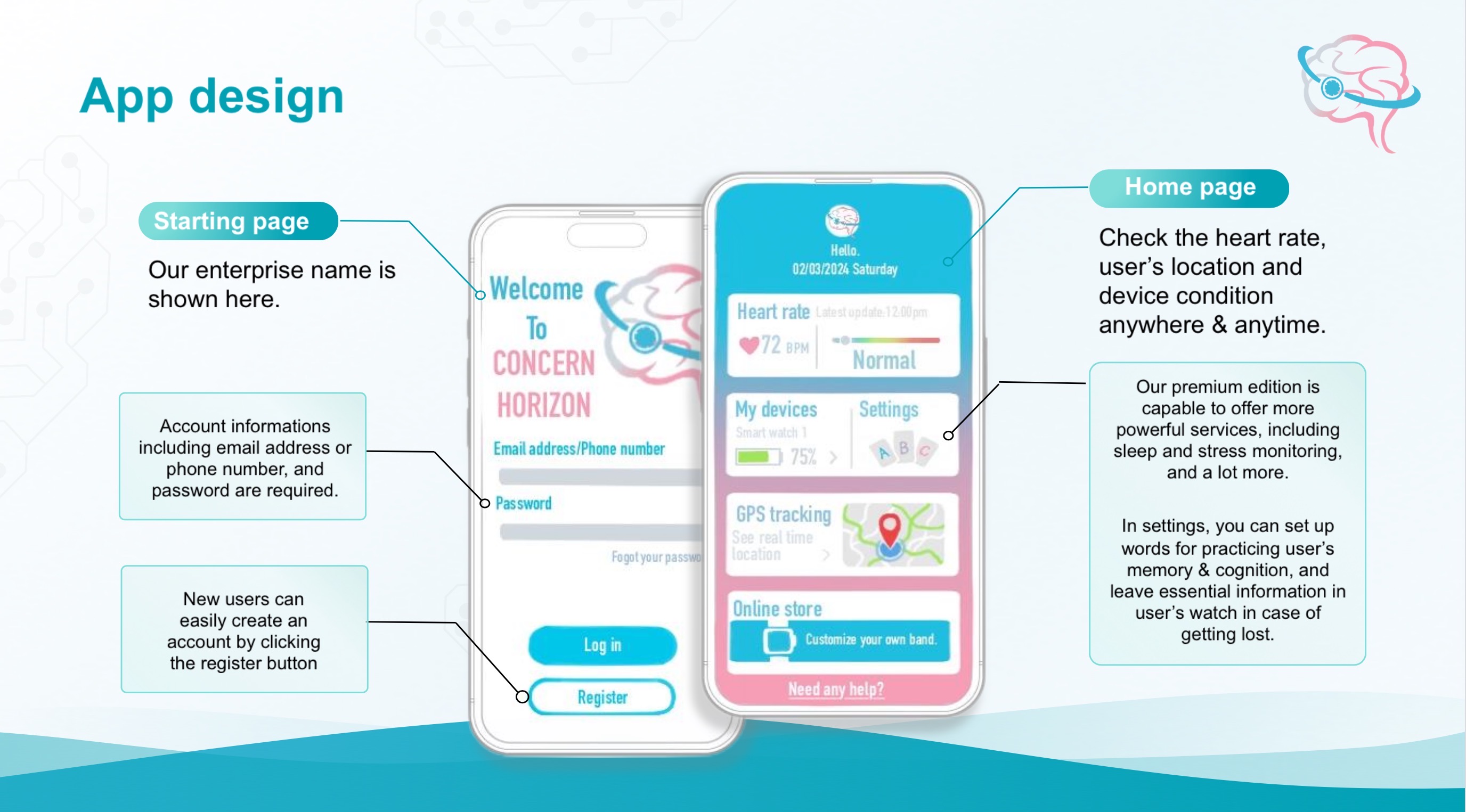 Concern Horizons smartwatch is designed to offer gentle yet effective support for Alzheimer's patients and their families. Features include emergency location, one-tap SOS, vital sign monitoring, memory aid, and cognitive training. With lightweight, flexible form and minimalist Eastern aesthetics, the system minimizes the feeling of surveillance. Visualized interfaces and intuitive flows help users seek help under stress, while families can intervene remotely. The product integrates technology and empathy to create a truly caring experience.